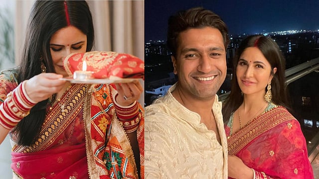 Katrina Kaif and Vicky Kaushal are celebrating their first Karwa Chauth today (October 13), and recently they have treated their Insta families to adorable pictures from their festivities with Vicky's parents, Sham Kaushal and Veena Kaushal. Katrina shared pictures and wrote, "Pehla Karwa Chauth." In the images, Katrina looks stunning in a pink saree, while Vicky can be seen in a white kurta pyjama set. Soon after she shared the post, Mini Mathur and Sharvari Wagh dropped heart emoticons in the comment section.