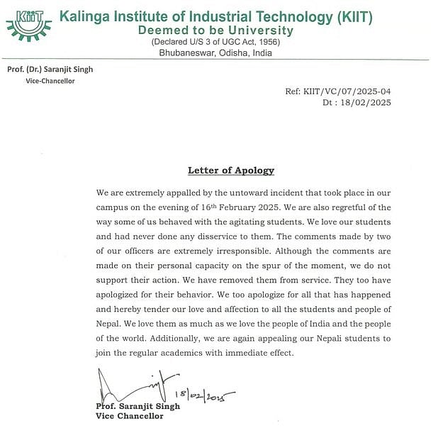 KIIT University in Bhubaneswar, Odisha, has issued an apology following an incident involving Nepali students. The university assured that it prioritizes student welfare and upholds the dignity of all individuals on campus.