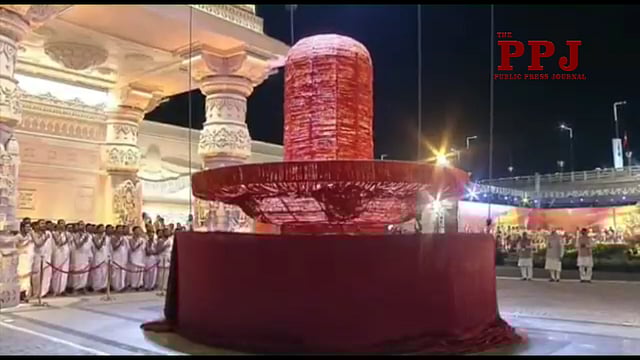 वैदिक मंत्रोच्चार के बीच रक्षा सूत्र (कलावे) से बनाए गए 15 फीट ऊंचे शिवलिंग की प्रतिकृति से मोदी ने रिमोट के जरिए जैसे ही आवरण हटाया, अध्यात्म का यह नया आंगन सभी के लिए खुल गया।