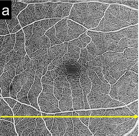 Pachyvessels are large, inwardly displaced, pathologically dilated choroidal vessels. Pachyvessels can cause focal choriocapillaris thinning and are associated with the pathogenesis of central serous chorioretinopathy (CSC)1. In optical coherence tomography (OCT) angiography images of CSC eyes, the area of choriocapillaris flow void was found to be high2, and the location of the choriocapillaris flow void was associated with the distribution of the underlying choroidal vessels3,4. Studies suggest that pachyvessels impair choriocapillaris and may be responsible for retinal pigment epithelium (RPE) damage, resulting in CSC. Therefore, pachyvessels may be a preclinical sign of CSC, and normal eyes with pachyvessels may have a potential risk of CSC.