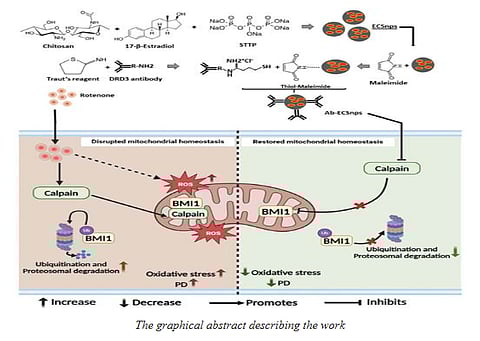 The targeted nano-formulation inhibited the mitochondrial translocation of calpain, thereby protecting neurons from rotenone-induced mitochondrial damage. Furthermore, the targeted nano delivery system alleviated behavioural impairments in a rodent model. Additionally, the study reveals for the first time that BMI1, a member of the PRC1 complex that regulates mitochondrial homeostasis, is a substrate of calpain. The targeted nano-formulation restored BMI1 expression by inhibiting its degradation through calpain.